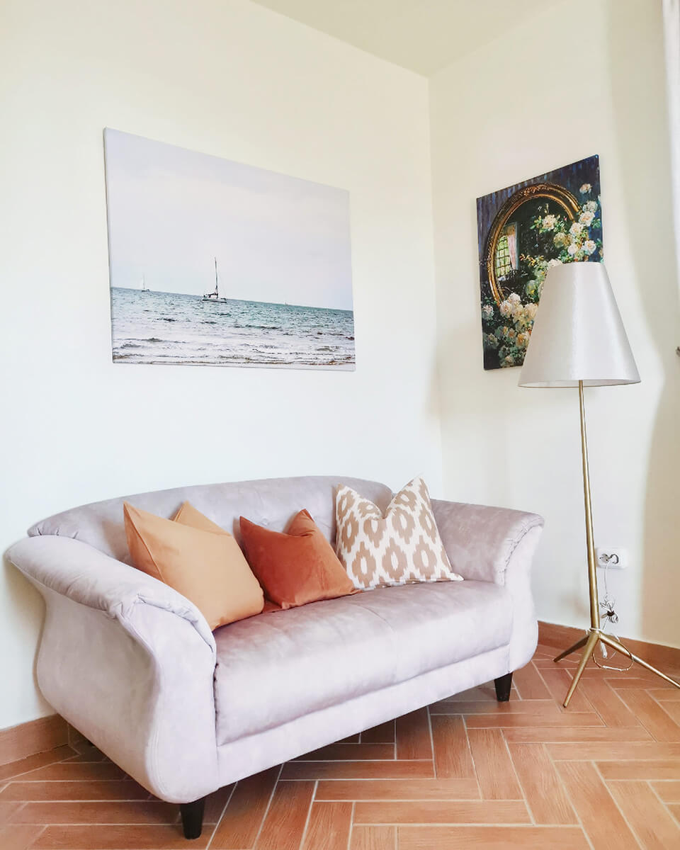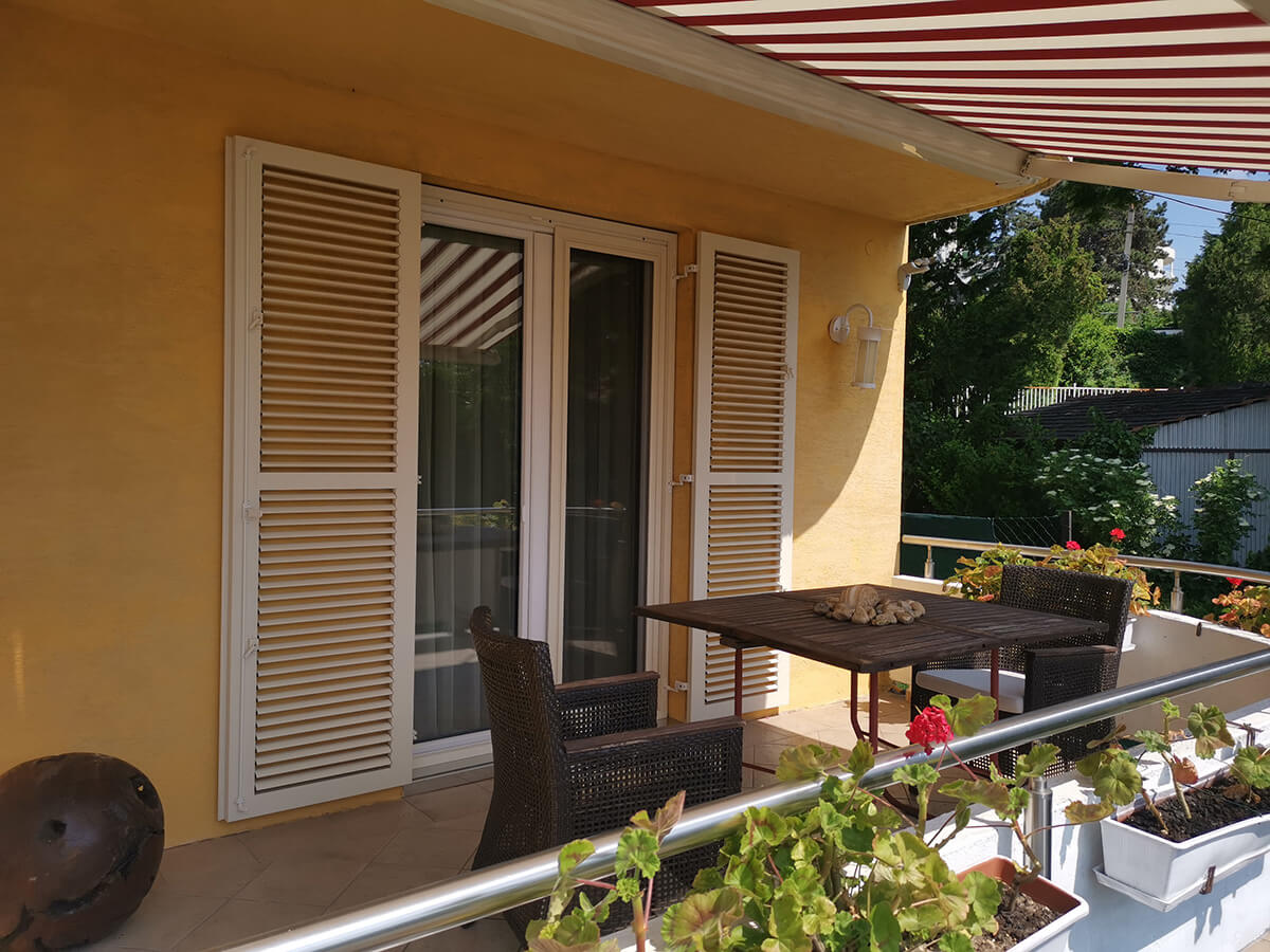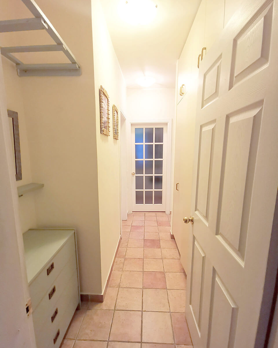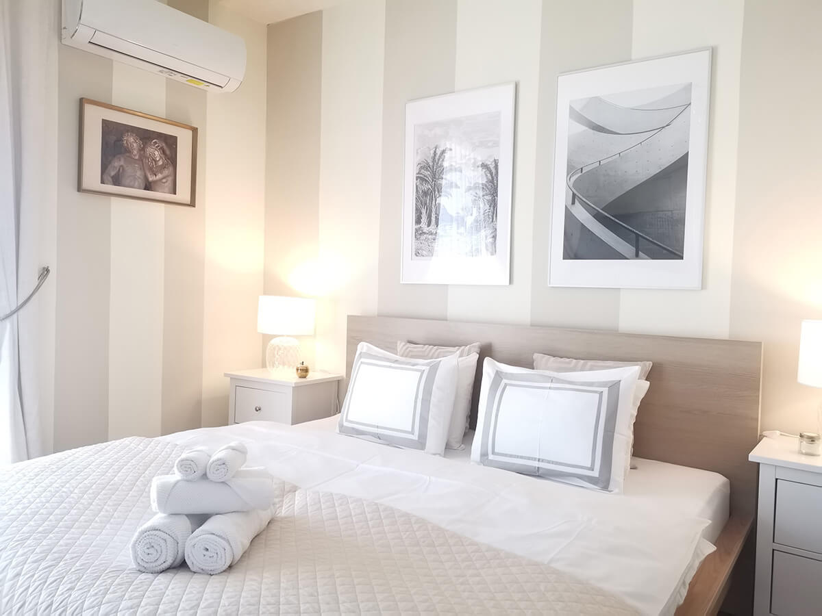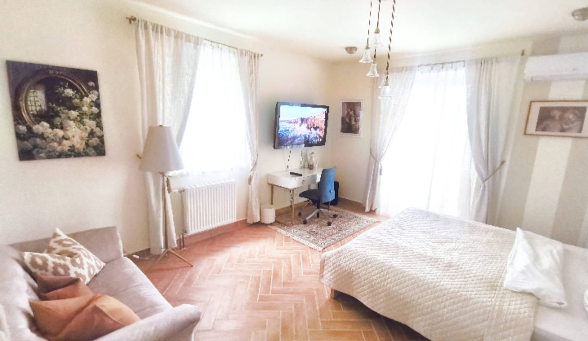A villa földszinti közös halljából nyíló önálló bejáratú 48 nm-es mediterrán hangulatú, összkomfortos apartman egy előszobából, fürdőkádas fürdőszobából, jól felszerelt konyhából és egy nagy, teraszos háló-nappali szobából áll. Az apartman gépesített: hűtő-fűtő klíma, padló- és radiátoros fűtés, okos TV, kerámia főzőlap, sütő, hűtőszekrény fagyasztórésszel, vízforraló, kávéfőző, kenyérpirító. A szobában található egy kényelmes íróasztallal, így home office-nak is ideális. Minden ablak és a teraszajtó is fel van szerelve szúnyoghálóval. A saját 15 nm-es terasza a Gellért hegyre, a városra és a budai hegyekre és villa romantikus rózsakertjére. Innen közvetlen lépcső vezet le a kertbe. Az apartman ablakai rovarhálóval védettek, így nyáron akár nyitott ablaknál is élvezhető a csönd és a jó levegő. A lakás klimatizált és télen padlófűtés és radiátorok gondoskodnak a kellemes hőmérsékletről.